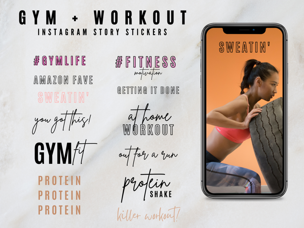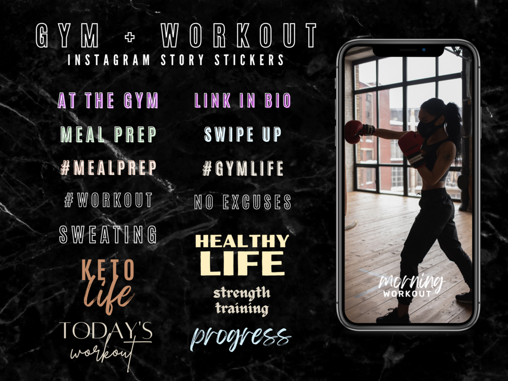 Essentail elements for bloggers, fitness influencers, fashion influencers, gym addicts, fitness buffs, yoga, barre, pilates, boxing, and anyone that loves to exercise and stay healthy! Help inspire those around you with these fresh new instagram stickers.
